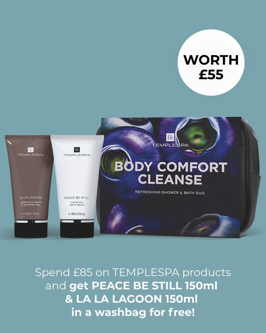 SPEND £85 ON TEMPLESPA PRODUCTS AND GET PEACE BE STILL 150ML & LA LA LAGOON 150ML IN A WASHBAG FOR FREE